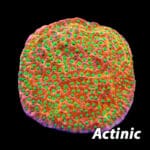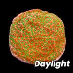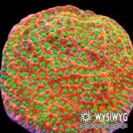 This rare Montipora is a plating variety and has green polyps, a purple/orange body, and a pink growth rim. This WYSIWYG frag is roughly 1.25″